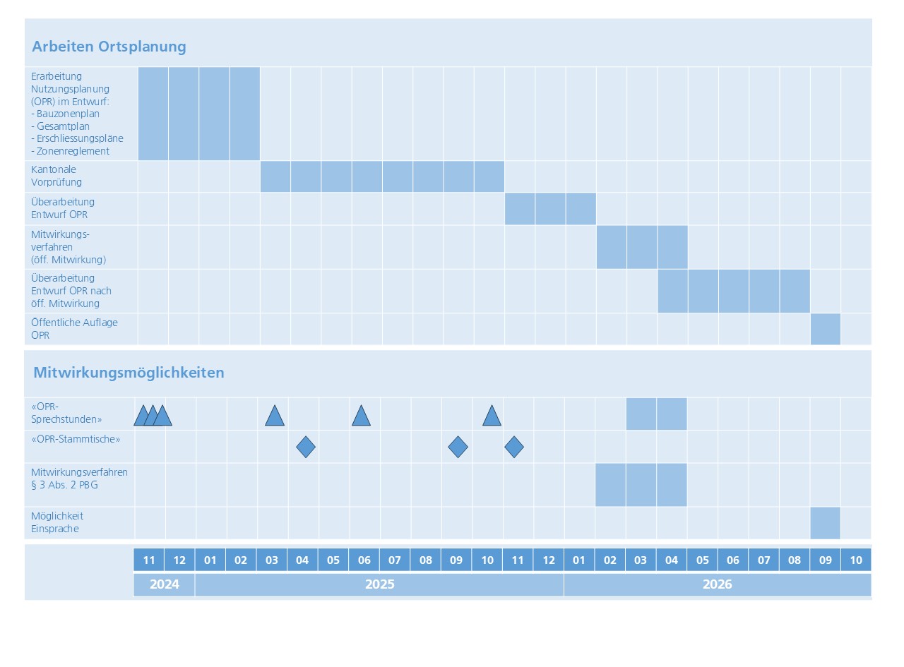 Die Entwürfe der revidierten Ortsplanungsrevision werden der Bevölkerung nach erfolgter Vorprüfung im Rahmen der öffentlichen Mitwirkung umfassend präsentiert. Diese wird voraussichtlich im Winter 2025/26 starten.